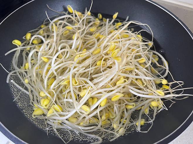 콩나물은 끓는 물에서 약 3분 정도 데칩니다. 이때 뚜껑은 반드시 열어 놓아야 비린내가 나지 않습니다.