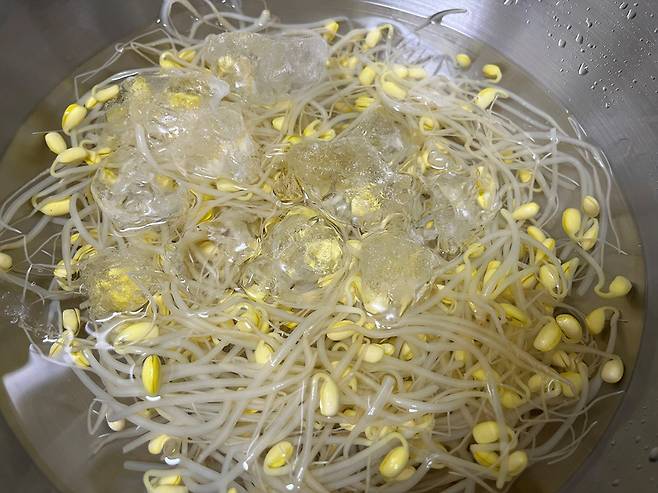 데친 콩나물은 꺼내서 찬물 또는 얼음물에 넣으세요. 이렇게 해야 잔열이 빠져나가면서 콩나물의 아삭한 식감을 살릴 수 있습니다.