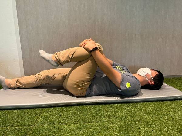 바닥에 편하게 누워 무릎을 가슴 쪽으로 당기고 양손으로 끌어안는 동작은 허리와 골반 근육을 풀어주는 대표적인 이완 자세입니다.