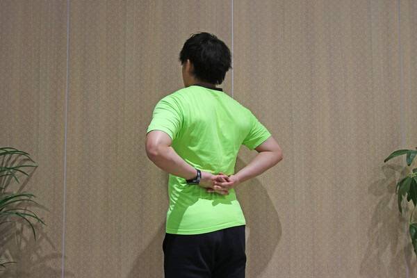 양팔을 등 뒤로 깍지 끼고 가슴을 활짝 펴며 팔을 뒤로 들어올리는 이 동작은 어깨 관절과 승모근, 가슴 근육의 긴장을 동시에 풀어주는 효과가 있습니다.