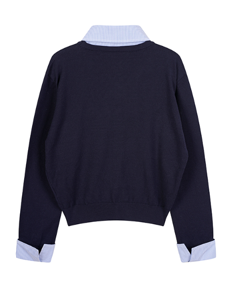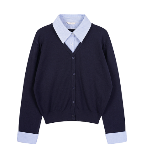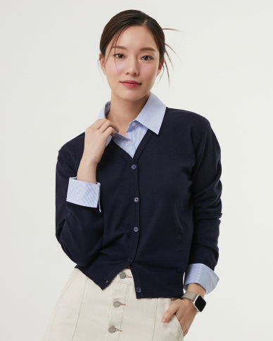 특히 눈길을 사로잡은 건 네이비 컬러의 플라스틱 아일랜드 레이어드 니트 가디건이었어. 셔츠랑 니트를 레이어드한 듯한 디자인 덕분에 꾸민 듯 안 꾸민 듯 말이야.