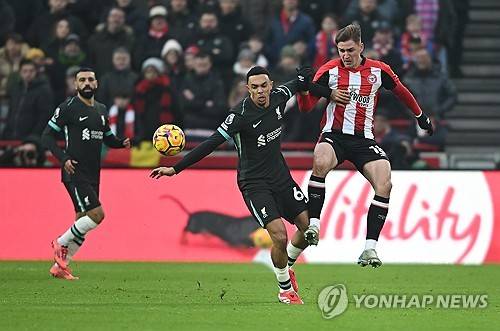 epa11834048 Brentford's Yehor Yarmolyuk and Liverpool's Trent Alexander-Arnold during the English Premier League match between Brentford FC and Liverpool FC, in London, Britain, 18 January 2025. EPA/DANIEL HAMBURY EDITORIAL USE ONLY. No use with unauthorized audio, video, data, fixture lists, club/league logos, 'live' services or NFTs. Online in-match use limited to 120 images, no video emulation. No use in betting, games or single club/league/player publications.