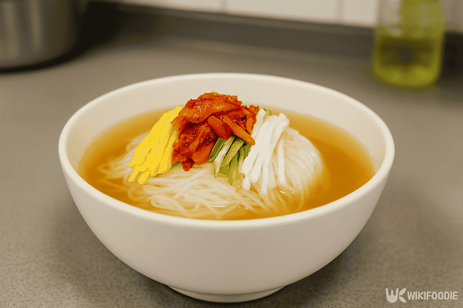 냄비에 다시마, 양파, 대파, 무, 멸치를 넣고 끓인다. 다시마는 물이 끓기 전 꺼내고, 거품은 제거한다. 20분 정도 끓인 후 재료들을 건져내고, 국물을 충분히 식혀 냉장 보관을 한다. 김치냉장고에 넣어두면 얼음 없이도 차갑게 즐길 수 있다.