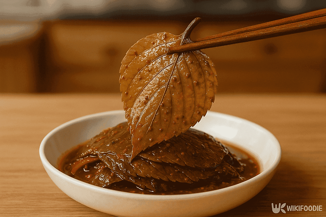 깨끗이 씻은 콩잎에 식초와 소주를 약간 넣고 20분 정도 삶는다. 삶은 잎은 채반에 받쳐 물기를 뺀다. 양념은 믹서기에 대파 흰 부분, 양파, 청양고추, 당근, 물 100ml, 멸치액젓 2큰술, 진간장 6큰술, 고춧가루 14큰술, 다진 마늘 1큰술, 매실청 2큰술, 다진 생강 1큰술을 넣고 살짝만 갈아준다. 건더기가 약간 남아 있는 정도가 먹음직스럽다.