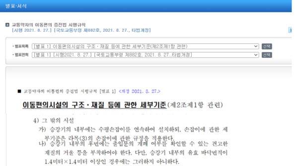 휠체어를 사용하는 장애인이 통상 엘리베이터 출입문을 등지면서 탑승하는데, 내부 공간이 좁은 경우 휠체어 방향을 전환하기가 쉽지 않다. 이에 휠체어를 180도 돌리지 않고도 출입문 개폐 여부를 확인할 수 있도록 하기 위해 의무적으로 거울을 달도록 한 것이다.