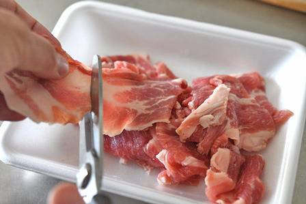 1. 고기는 얇게 썰어 준비한다. 돼지고기는 앞다리살이나 목살, 소고기는 불고기용이나 국거리용 자투리 고기를 쓰면 좋다. 크기가 크면 가위로 잘라준다.