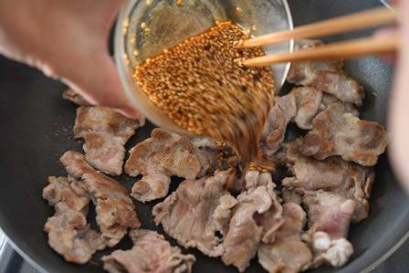 3. 팬을 중불로 달궈 고기를 펼쳐 넣고 살짝 볶는다. 8~9부 정도 익었을 때 준비한 양념장을 붓는다.