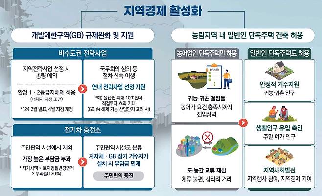 이는 그간 농어업 종사자용 단독주택만 허용돼 귀농·귀촌의 걸림돌로 작용하던 규제를 완화한 것이다. 국토교통부는 농림지역 중 보전산지, 농업진흥구역을 제외한 약 500㎢가 혜택을 받을 것으로 예상했다. 특히, 주말 및 여가를 즐기려는 생활인구 유입이 촉진돼 농촌지역의 경제 활성화에 기여할 수 있을 것으로 기대하고 있다.