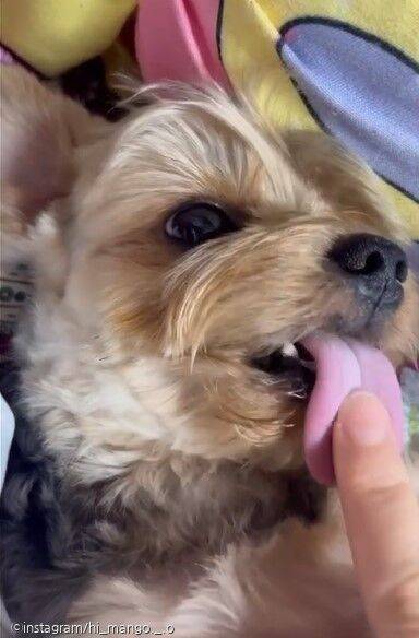 혜숙 씨는 "망고가 자주 혀를 빼놓고 있는데 저 날 장난기가 발동해서 혀에 계속 손을 가져다 대고 털에 묻혔는데 가만히 있는 모습이 귀여워 영상으로 찍었다"고 설명했다.