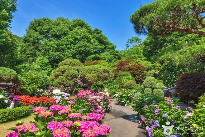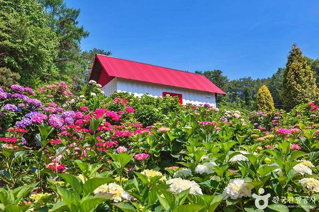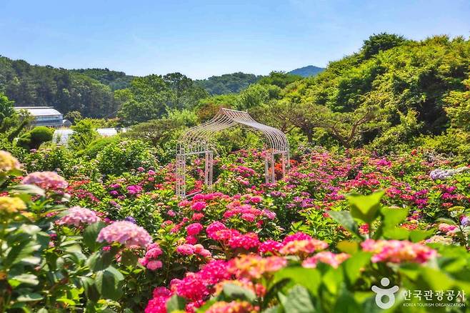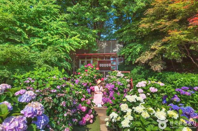6월 초부터 본격적으로 수국의 계절이 시작된다. 식물원 곳곳에 흰색, 분홍, 연보라빛 수국이 피어나 폭신한 구름처럼 정원을 채운다. 쉼터 개념으로 설계된 공간답게 벤치, 평상, 돗자리 공간이 잘 마련돼 있어 꽃 사이에서 여유롭게 머물 수 있다.