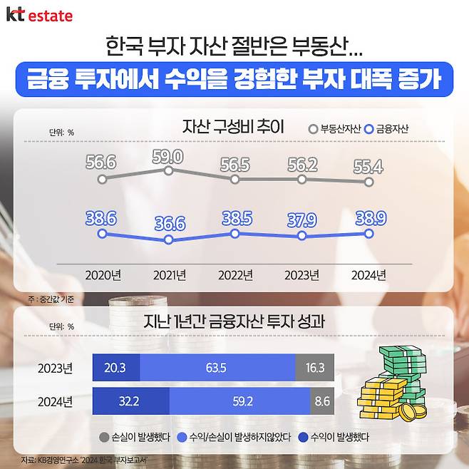 전년 대비 부자의 부동산 자산 비중은 부동산 가격 하락으로 0.8% 감소했고, 금융 자산 비중은 주식 시장 반등으로 1.0% 증가했습니다. 일반 가구가 부동산 자산 78.6%와 금융 자산 16.8%로 구성된 것과 비교하면, 부자들은 부동산 쏠림 현상이 일반 가구보다 덜하며, 금융 자산 비중이 일반 가구보다 2.3배 많은 것을 알 수 있습니다.