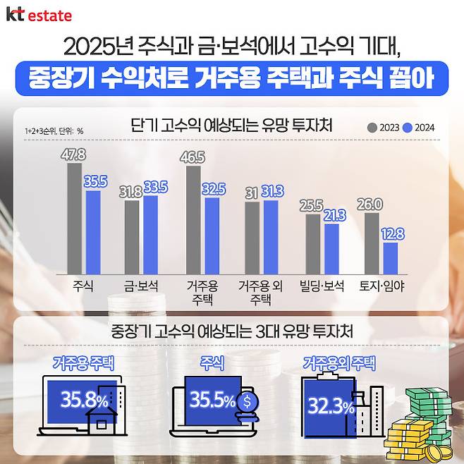 그렇다면 부자들은 올해 어떤 자산에 관심이 많을까요? 부자들이 꼽은 2025년 유망 투자처 1순위는 주식(35.5%)이었습니다. 다음으로는 금·보석(33.5%)이 2위로 전년(3순위) 대비 순위가 상승했으며, 반대로 지난해 2위인 거주용 주택(32.5%)은 한 단계 하락해 3순위를 차지했습니다. 또한, 향후 3~5년 정도 중장기적으로 고수익이 기대되는 3대 유망 투자처로 거주용 주택(35.8%)과 주식(35.5%), 거주용 외 주택(32.3%)을 꼽았습니다.