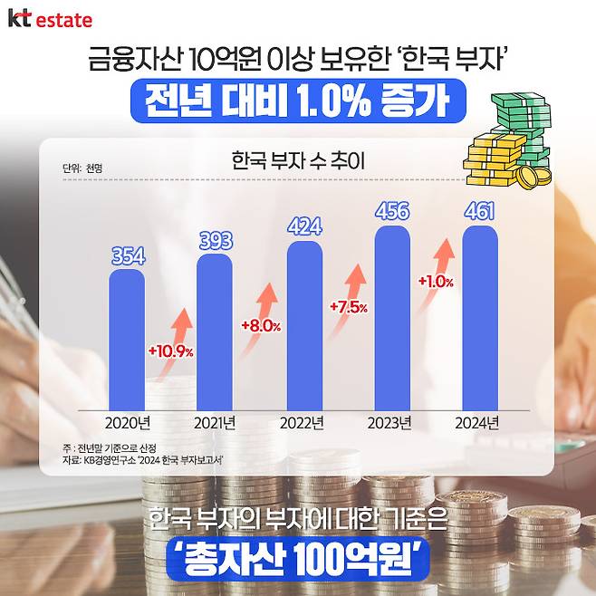 KB경영연구소가 최근 발간한 ‘2024 한국 부자보고서’에 따르면, 2024년 금융자산을 10억원 이상 보유한 ‘한국 부자’ 증가율이 역대 최저라 밝혀 화제입니다. 지난해 우리나라 부자 수는 2023년 45만6000명과 비교해 1.0%(5000명) 증가했는데, 통계 집계 이후 가장 낮은 수준이었습니다.