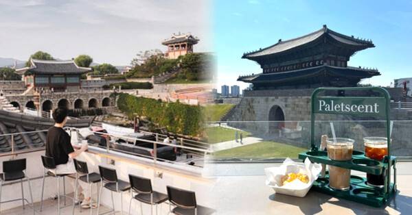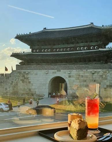 수원 장안문이 한 눈에 보이는 카페 팔레센트는 통 창으로 보이는 장안문의 웅장함을 온전히 느끼실 수 있는 곳입니다. 특히 봄철이면 아름다운 푸른 녹음과 함께 화성 행궁 야간 라이트업 행사로 한국의 아름다움을 느낄 수 있습니다.