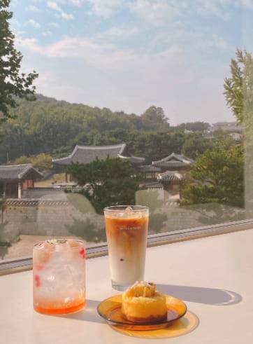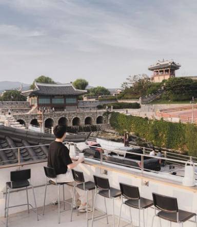 또 야외 테라스석에서는 화성행궁을 사방에서 온전히 감상할 수 있어 다른 카페와 차별점이 있는데요. 카페 2층에 마련된 야외 테라스에는 접이식 간이의자와 함께 소담한 한옥 지붕들을 감상할 수 있어 따뜻한 봄 햇살을 감상하기 좋습니다.