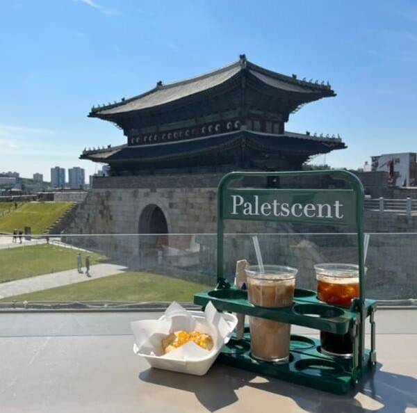 수원 장안문이 한 눈에 보이는 카페 팔레센트는 통 창으로 보이는 장안문의 웅장함을 온전히 느끼실 수 있는 곳입니다. 특히 봄철이면 아름다운 푸른 녹음과 함께 화성 행궁 야간 라이트업 행사로 한국의 아름다움을 느낄 수 있습니다.