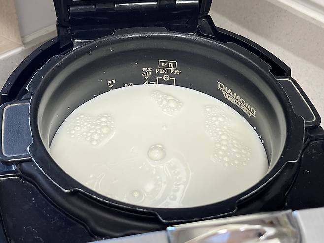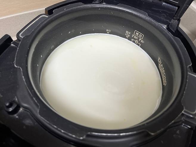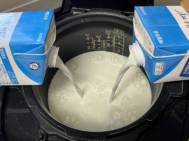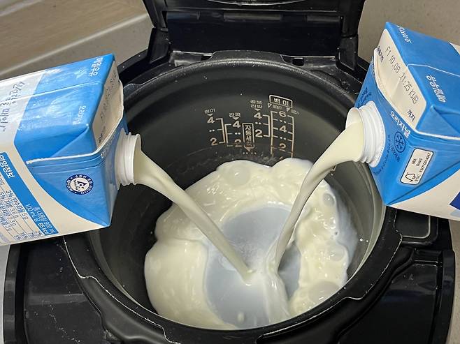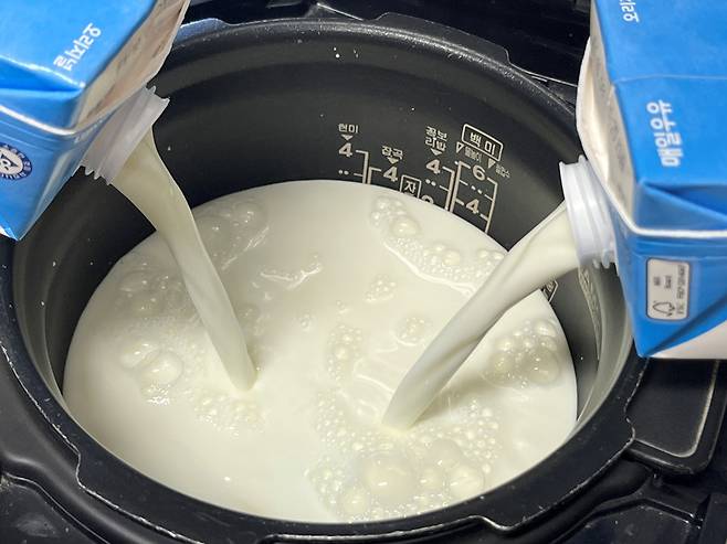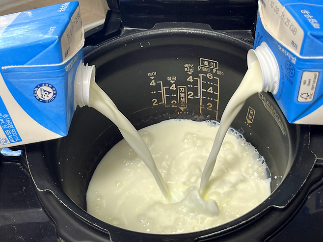 밥솥에 900ml 우유 2개를 쏟아붓습니다. 양을 적게 만들고 싶으신 분들은 우유를 한 팩만 넣으셔도 됩니다. 대신 농후 발효유도 1개만 넣으세요.