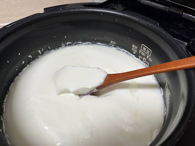 반드시 보온과 발효 시간을 잘 지켜주셔야 요거트가 완성됩니다. 보온 1시간 및 발효 10시간 지난 후 밥솥을 열어보니 우유가 뭉쳐져서 부드러운 요거트가 완성되었습니다.