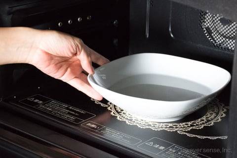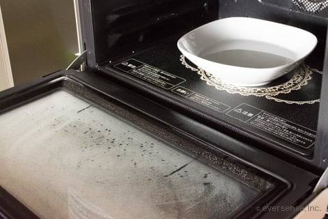 내열용기에 물 1컵 + 식초 2~3큰술을 섞어 전자레인지 안에 넣습니다.