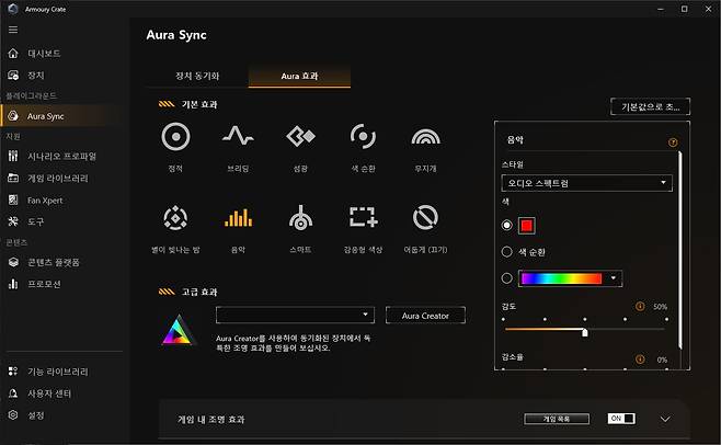 ASUS는 Armoury Crate라는 소프트웨어로 AURA SYNC라는 연동 기능을 제공한다. Armoury Crate는 ASUS 메인보드를 장착한 PC에 Windows를 새로 깔면 설치를 권장하는 메시지 창이 뜬다. 그 메시지 창을 이용하지 않는다면 제조사 홈페이지에서 쉽게 내려받을 수 있다. AURA SYNC는 다른 메인보드 제조사들보다 패턴이나 애니메이션이 더 다양한 편이다. 숨을 쉬듯 조명이 어두워졌다 밝아졌다를 반복하는 브리딩, 번쩍번쩍 요란한 섬광 효과는 물론 PC에서 나오는 음악에 따라 LED 컬러가 순환되는 효과도 연출할 수 있다. 하지만, 다른 제조사들의 소프트웨어보다 리소스를 많이 잡아먹는 편이고 Armoury Crate에 Fan Xpert 등도 같이 제어해야 하므로 분야별 업데이트가 잦고 프로파일 생성을 강요하기도 한다.