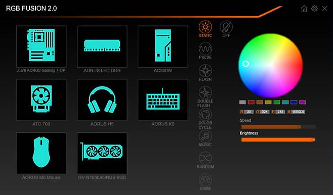 기가바이트는 AORUS 시리즈를 중심으로 RGB Fusion 2.0이라는 소프트웨어를 제공한다. 기본적인 RGB 세팅과 다양한 커스터마이징 기능을 제공한다. 타사의 소프트웨어보다 제어 인터페이스가 심플해서 사용하기가 편리하다는 평가가 많다. 특히 메인보드 단자의 위치별로 독립된 컬러 설정이 가능하고 비교적 다양한 프리셋이 준비되어 초보자들도 쉽게 커스터마이징을 할 수 있다는 점이 매력적이다. 하지만, 버그로 인해 작동 불가 현상이 자주 발생하여 이를 고치는 동영상이 사용법을 안내하는 동영상보다 더 많이 올라올 정도다.