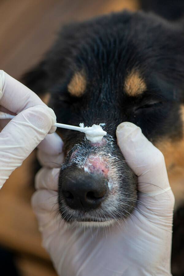 세균으로 감염되어 발생하게 되는 점막 농피증은 코 부위에 집중적으로 나타날 수도 있다. 이런 염증이 생기게 되면서 코가 까지게 될 수도 있는데 이런 경우에는 병원에 내원해 항생제 성분을 포함한 연고를 따로 처방을 받아 발라주어야 한다.