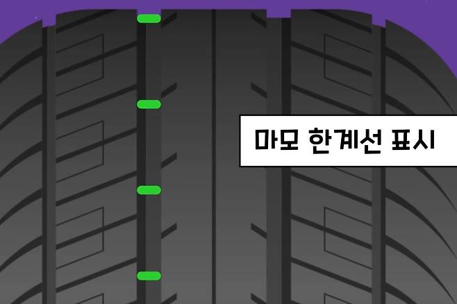 타이어 표면의 굵은 홈 사이사이에 짧은 선이 돌출되어 있는 것이 마모한계선입니다.