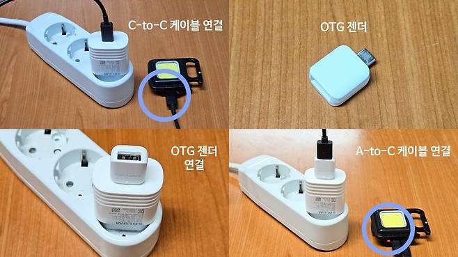 이럴 경우, OTG 젠더를 사용하면 충전을 진행할 수 있습니다. OTG 젠더를 충전기의 C포트에 꽂은 후 A-to-C 케이블을 OTG 젠더에 연결한 다음 케이블을 기기에 연결하면 됩니다. OTG 젠더는 C포트를 A포트로 변환해 주고 5V 일반 충전 방식으로 변환해 줍니다.