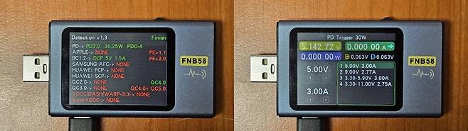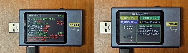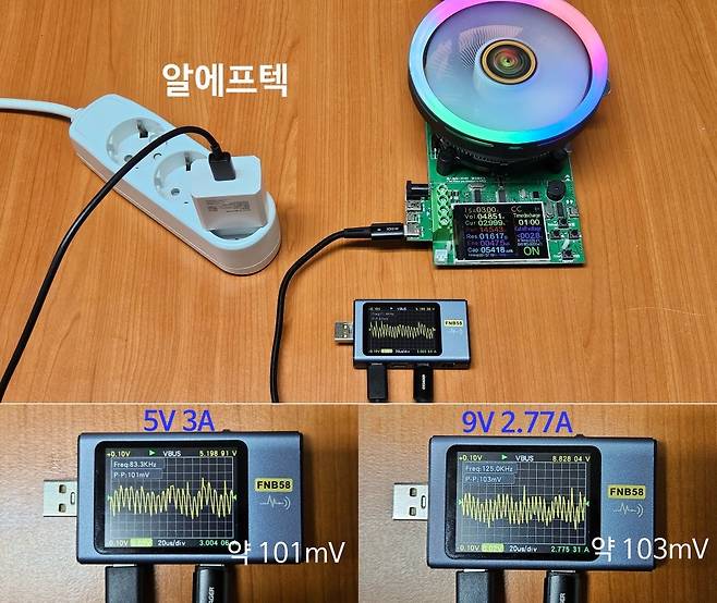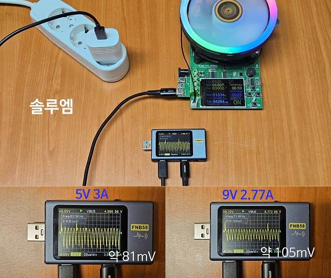 삼성 정품 충전기는 5V 출력은 3.27A에서, 9V 출력은 3.02A에서 전원이 차단되었습니다. 알에프텍 충전기는 5V 출력은 3.26A에서, 9V 출력은 2.98A에서 전원이 차단되었습니다. 솔루엠 충전기는 5V 출력은 3.33A 넘어서면 전압이 조금씩 낮아지고 3.39A에서, 9V 출력은 3.11A 넘어서면 전압이 조금씩 낮아지고3.15A에서 전원이 차단되었습니다. 3가지 제품 모두 비슷한 전류에서 차단되는 모습을 보여주었습니다.