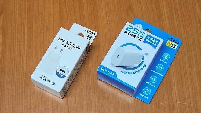 솔루엠의 C타입 25W 충전기와 알에프텍의 C타입 25W 충전기 2종입니다. 두 회사 모두 삼성에 충전기를 납품하는 회사로 충전기 관련해서 인지도 있는 회사입니다. 제작 품질이 검증된 회사의 초고속충전을 지원하는 25W 충전기를 정품 대비 반값도 안 되는 5,000원에 판매하다 보니 품절되는 상황이 일어난 것 같습니다. 삼성 납품회사라는 인지도와 납품하는 제품과 비슷한 사양의 충전기를 다이소 가격에 런칭하고 마케팅했다는 점이 소비자의 관심을 끈 것으로 보입니다.
