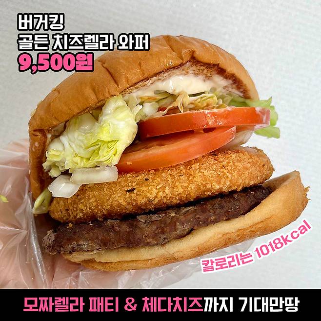 그다음 버거킹의 골든 치즈렐라 와퍼! 단품 가격이.. 9,500원?!! 이랍니다. 진짜 가격 무슨 일.. 더군다나 칼로리는 1018kcal로 엄청난 칼로리(헉) 아마 저 치즈 패티 때문일까요?