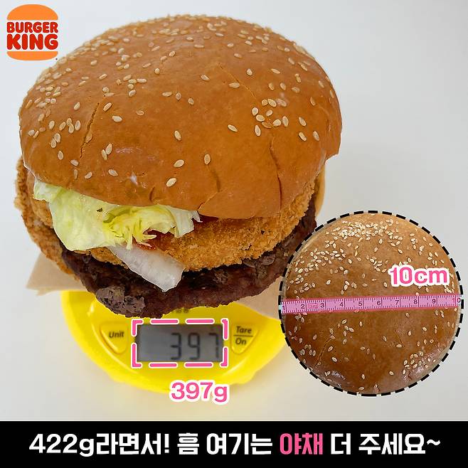 버거킹 골든 치즈렐라 와퍼! 확실히 맥도날드 버거보단 두툼하죠? 버거 받았을 때도 묵~직한 게 이건 중량이 좀 나가겠구나 싶더니 397g이네요. 하지만 422g이라면서.. (두둥) 다시 한번 외칠게요. 야채.. 조금만 더 주세욥.