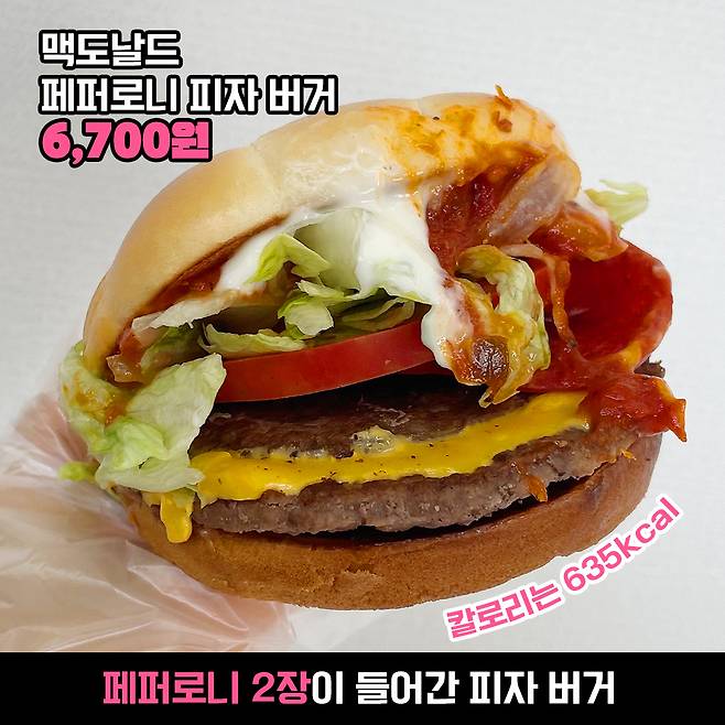우선 첫 번째로 맥도날드의 페퍼로니 피자 버거 입니다. 단품 가격은 6,700원이고 칼로리가 635kcal로 뭐 햄버거치고 쏘쏘한 칼로리인듯해요!