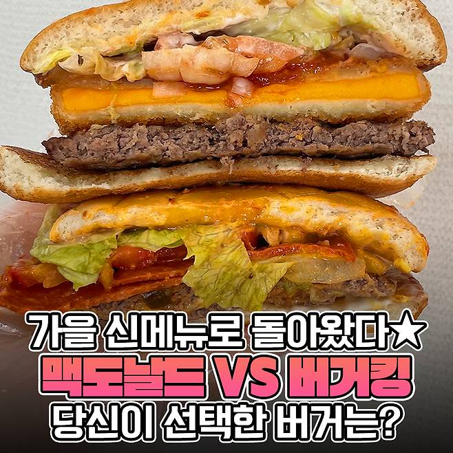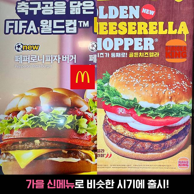 어떻게 가을 딱 맞춰서 이렇게 나왔니! 앞서 말했듯이 두 버거 모두 비주얼이 대박적이죠.. 축구공 번을 띈 맥도날드 페퍼로니 피자 버거와 체다치즈와 모짜렐라를 섞은 버거킹 골든 치즈렐라 와퍼!