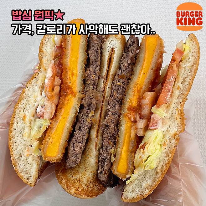 밥심의 원픽은 버거킹 골든 치즈렐라 와퍼입니다! 솔직히 버거킹 가격이 조금이라도 낮았으면 자주 사 먹었을 듯한데 세트로 먹으면 만 원이 넘어가잖아요.