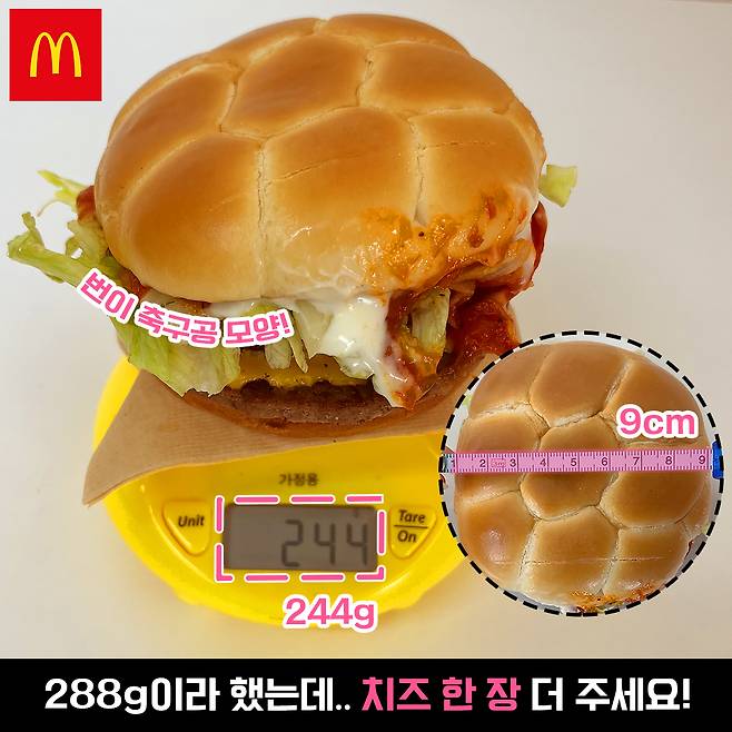맥도날드 페퍼로니 피자 버거 중량을 재보니 244g이 나오더라구요. 288g이라고 본 밥심은 소심하게 외쳐봅니다ㅎㅎ 치즈 한 장 더 주세요! 길이는 9cm입니다~