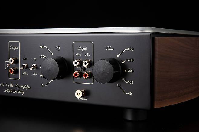 후면을 보면 직관적으로 세팅할 수 있게, 토글 스위치 및 노브로 조절할 수 있는 구조이다. 암호를 푸는 듯한 딥스위치 구성보다 확실히 이쪽이 더 편하다. 후면에서 MM/MC, 하이/로우, 커패시턴스, 임피던스 등을 자유롭게 세팅할 수 있다. 노브를 통해 커패시턴스는 0/150/270/470/560㎊로 조절할 수 있으며, 임피던스는 40/100/200/400/800Ω으로 설정할 수 있는데, 자신의 카트리지 스펙을 보면서 최적의 세팅값을 맞추면 된다. 그러고 보면 지금까지 마스터 사운드는 프리앰프나 인티앰프에 MM 포노단 정도만 장착했는데, 이번에 처음으로 MM과 MC 모두 담아낸 포노 앰프를 출시하게 된 셈이다.