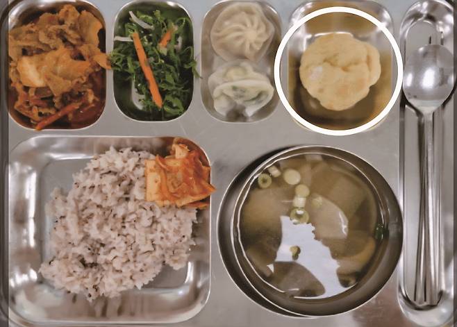 두 번째는 김치입니다. 우리 학교 배추김치는 특히 더 아삭하고 시원해요. 김치가 매일 반찬으로 나와 정말 좋아요.
