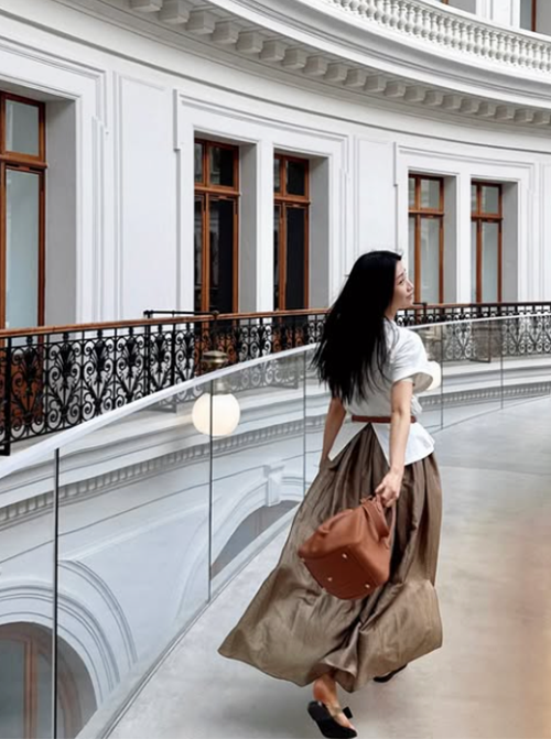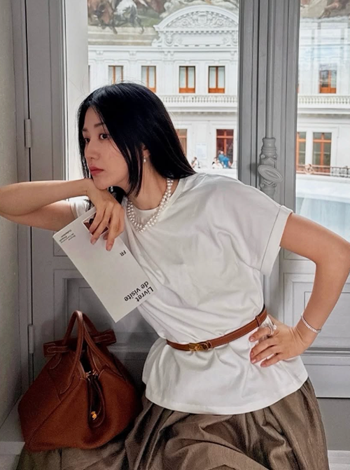 여기에 클래식한 진주 목걸이를 더해 심플한 상의에 포인트를 주었고, 얇은 가죽 벨트를 이용해 허리 라인을 잡아 여성스러운 실루엣을 강조했다.