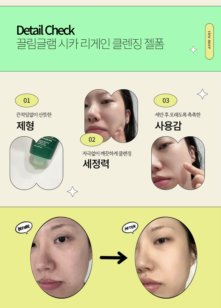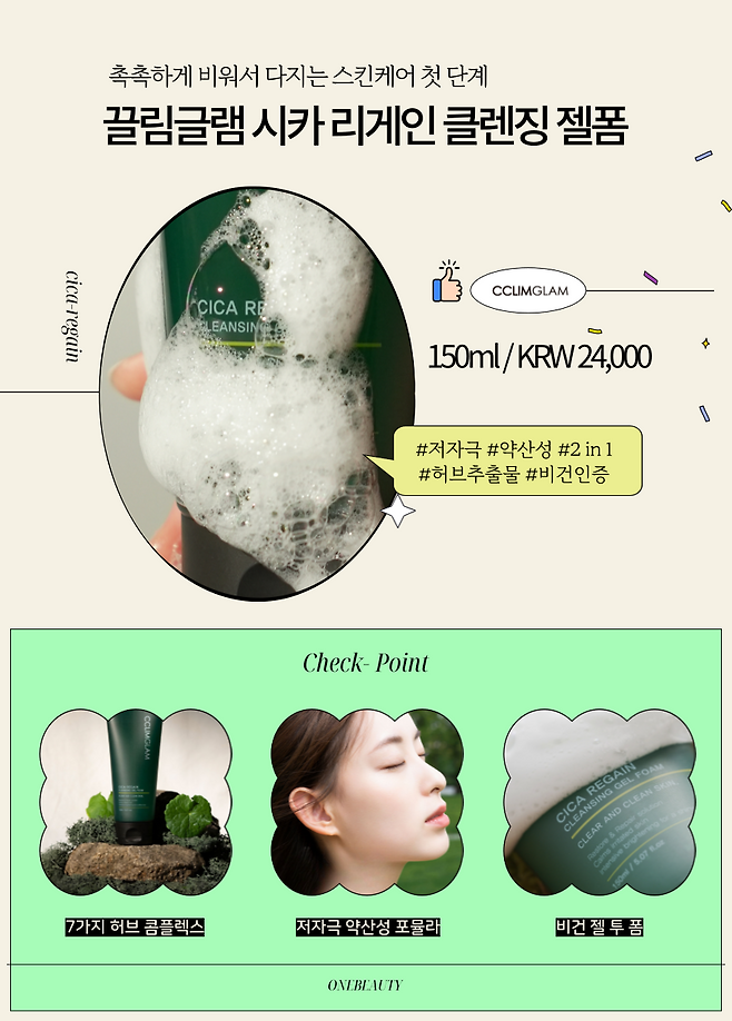 에디터가 사랑해마지않는 끌림글램의 시카 리게인 클렌징 젤폼은 병풀추출물, 캐모마일 꽃, 스페인 감초뿌리, 녹차 추출물, 로즈마리 잎, 호장근 뿌리, 황금 추출물까지 총 7가지 허브 콤플렉스로 만들어진 저자극 약산성 포뮬라의 젤폼으로 클렌징 후 자극받고 건조하기 쉬운 피부 대신 수분크림을 바른 듯 촉촉하고 생기 있는 피부를 선사해 노화를 예방하는 제품.