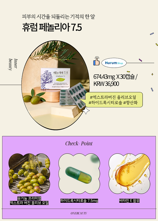 휴럼 페놀리아 7.5에는 신의 열매라고 불리는 올리브오일의 핵심 성분을 캡슐 1개에 꽉 채워 담았어.