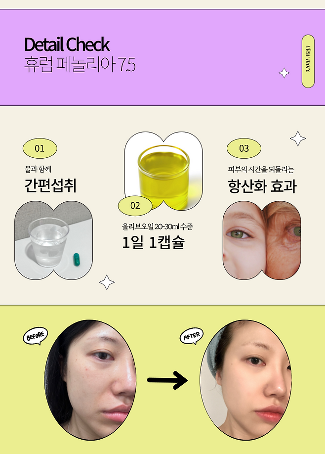 간편하게 물과 함께 섭취해 주면 항산화와 피부 케어의 핵심 성분인 하이드록시티로솔 7.5mg을 그대로 흡수할 수 있어.