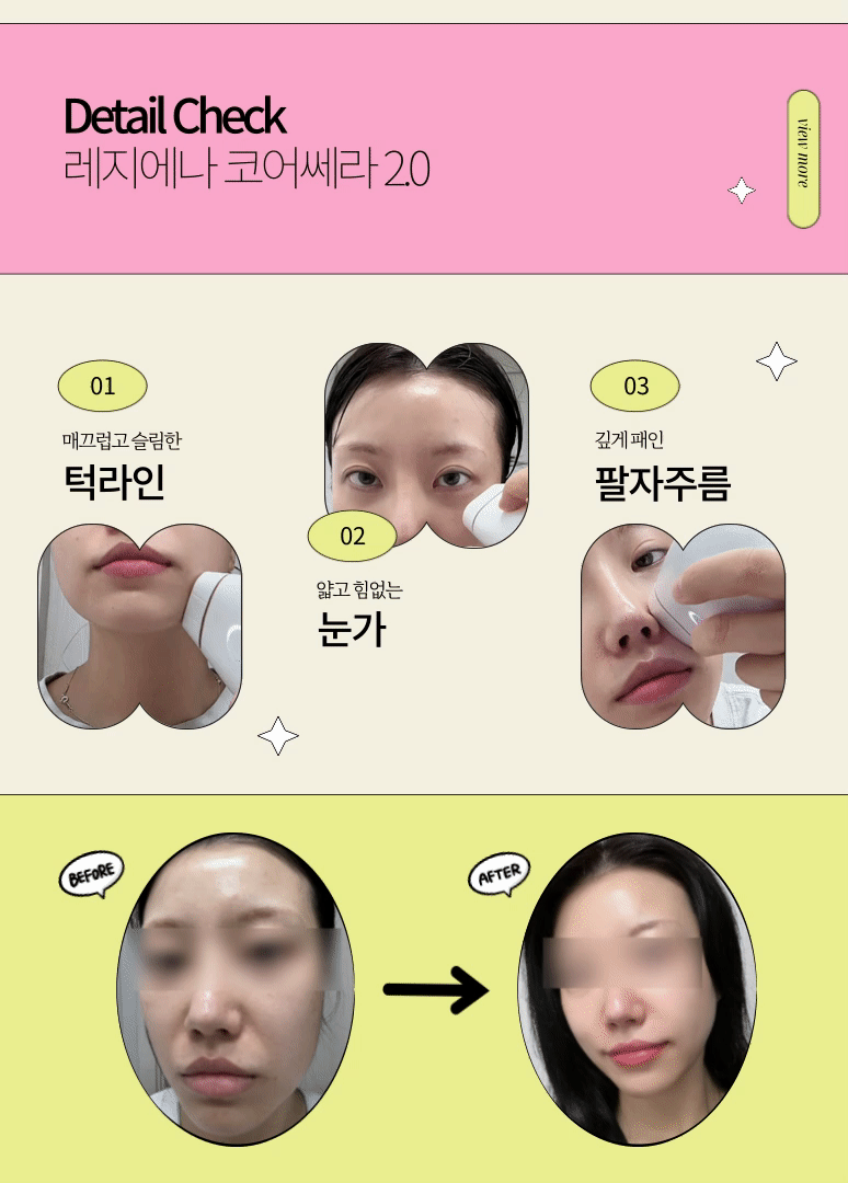 중력에 의해 가장 먼저 늘어질 수밖에 없는 얇은 눈가부터 비교적 두텁고 뭉쳐있는 턱 주변 페이스라인까지 코어쎄라의 레벨을 조절해 주며 조사해 주면 돼.