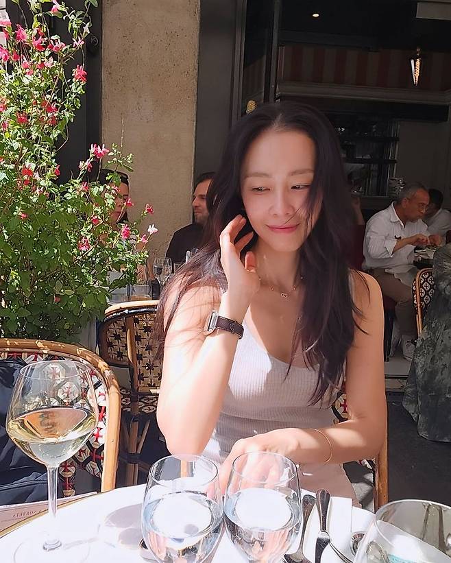 사진 속 홍수현은 자연광이 부드럽게 퍼지는 야외 테라스에서 여유로운 시간을 보내는 모습이다. 내추럴하게 흐르는 긴 생머리와 잔잔한 웨이브가 로맨틱한 무드를 더했고, 심플한 골드 목걸이로 포인트를 준 것이 인상적이다. 글래스웨어와 미네랄 워터가 깔끔하게 놓인 테이블 세팅과 어우러져, 전체적으로 세련되고 고급스러운 인상을 완성했다.