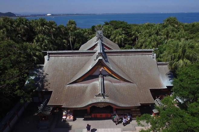 붉은 도리이를 지나면 우측으로 넓은 바다, 좌측으로 청량감 느껴지는 산. 그 앞을 지나가면 뻥 뚫린 동굴 속에 본전(本殿)이 나타나는데요. 우도 신궁은 일본에서도 드물게 해안가에 세워진 신사로, 한여름 본전에서는 서늘하고 신성한 공기가 주변에 흐른다고 전해집니다.