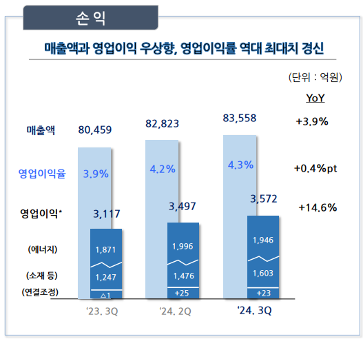 소재 사업은 원자재 시황 악화와 전기차 캐즘의 영향으로 지난해와 비슷한 수준의 실적을 보였다. 3분기 철강 사업 매출은 2조9975억원으로 전년동기 대비 1.4% 증가했지만 영업이익은 10.6% 줄어든 495억원으로 나타났다. 친환경차 부품인 구동모터코아의 매출은 29.4% 감소한 722억원이었으며, 영업손실 19억원을 내며 적자전환했다. 다만 3분기에 반영된 재고평가손실 20억원을 제외하면 소폭의 이익을 기록했다.
