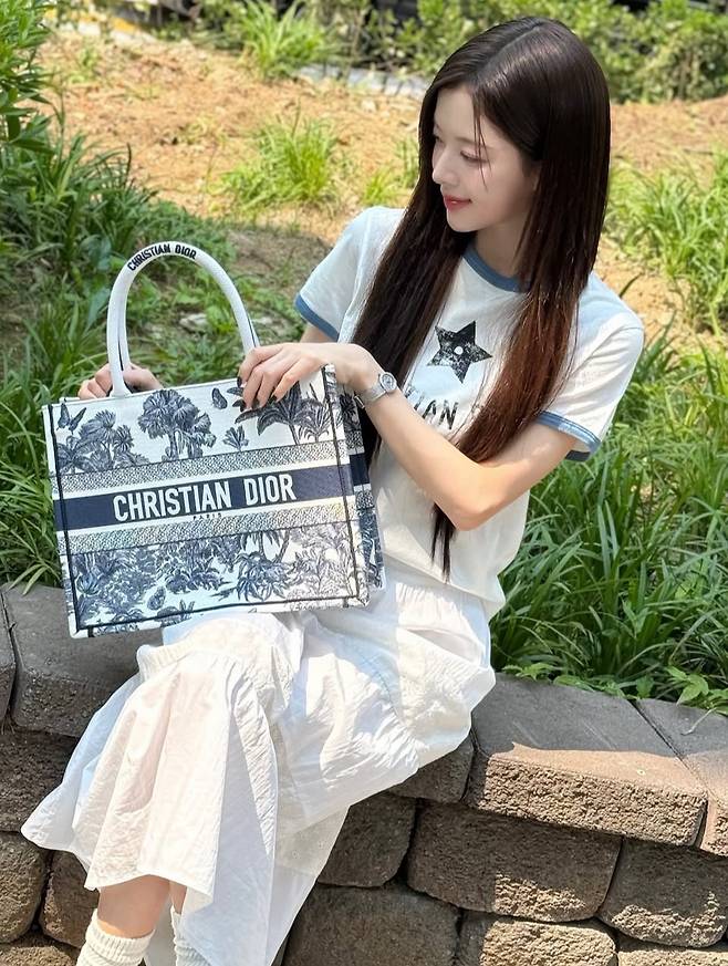 화이트 계열의 롱스커트와 베이비 블루 포인트가 들어간 반팔 티셔츠를 매치해 청순하면서도 단정한 이미지를 완성했습니다.