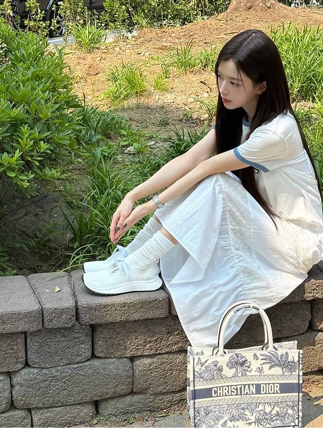 흰 양말과 운동화, 그리고 미니멀한 시계 액세서리를 통해 전체적인 스타일의 통일감을 유지하며, 긴 생머리로 깔끔하고 세련된 실루엣을 강조했습니다.