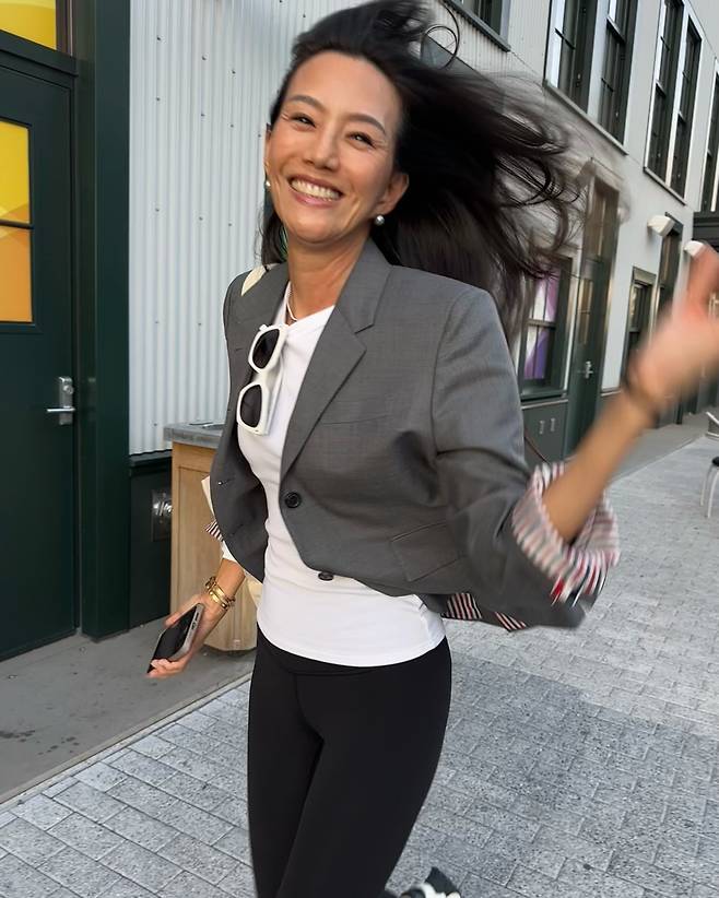 김민은 회색 재킷에 화이트 티셔츠를 매치한 비즈니스 캐주얼 스타일을 연출하고 있다. 깔끔한 테일러링의 재킷은 어깨 라인을 단정하게 살리며, 블랙 팬츠와의 조합으로 모노톤의 세련된 분위기를 완성했다. 화이트 선글라스가 포인트 아이템 역할을 하며, 도시적이고 모던한 감각을 더하고 있다.