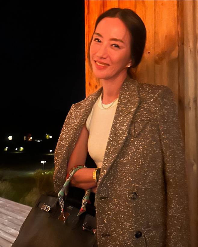 반짝이는 스팽글 장식의 재킷으로 화려한 이브닝 룩을 연출하고 있다. 골드 톤의 스파클 소재가 조명과 어우러져 럭셔리한 분위기를 자아내며, 심플한 화이트 이너웨어와의 대비로 세련된 밸런스를 유지하고 있다. 미니멀한 액세서리로 과하지 않은 우아함을 완성했다.